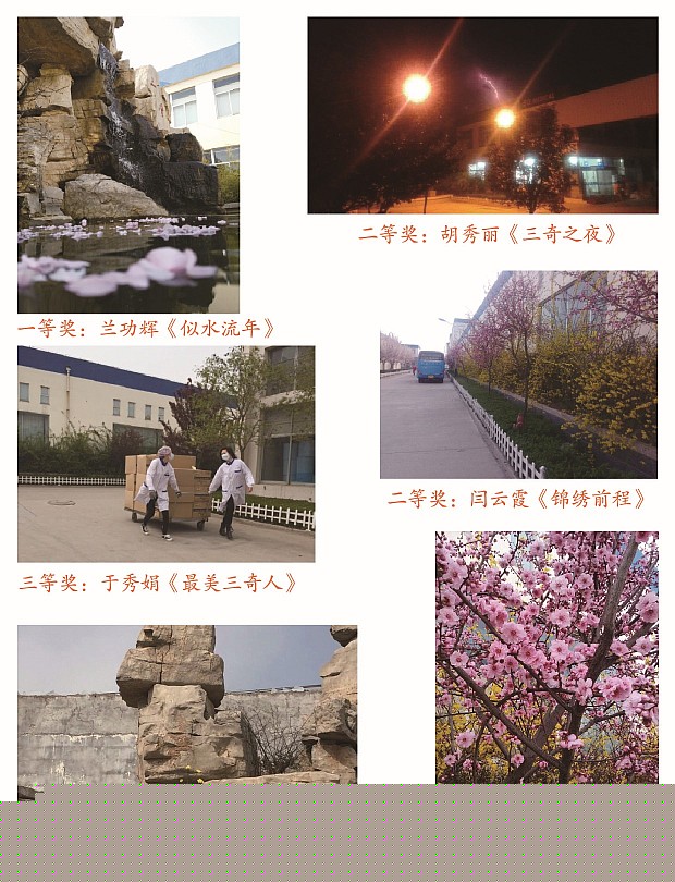 “五四”青年節(jié)前夕,公司團支部組織開展了攝影比賽活動。經(jīng)激烈角逐,評出了一等獎1名、二等獎2名,三等獎3名。一等獎:六車間蘭功輝的《似水流年》二等獎:倉庫主任的胡秀麗《三奇之夜》;五車間閆云霞的《錦繡前程》三等獎:銷售處于秀娟的《最美三奇人》;銷售處焦娜的《巖上花 》;四車間...